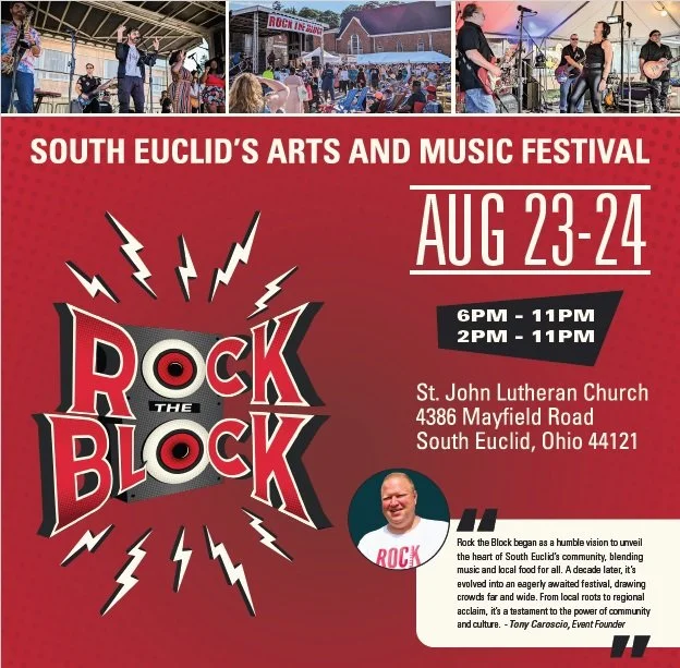 Rock the Block began in South Euclid as a free event featuring music, food, businesses, and nonprofits. Fast forward to 2024 and we’re celebrating the 10-year milestone of Rock the Block which has evolved into a regional arts and music festival, attracting attendees from Northeast Ohio and beyond!